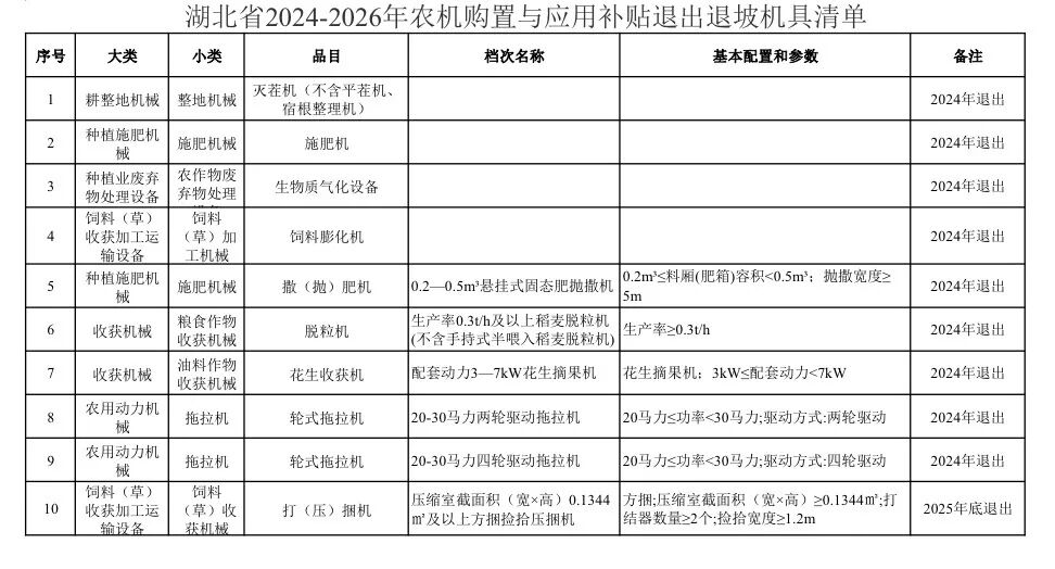 湖北省2024-2026年农机购置与应用补贴退出退坡机具清单