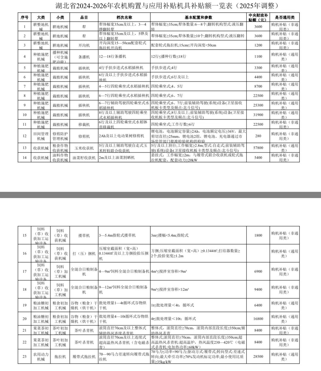 湖北省农业农村厅近日发布通告,确定湖北省2024-2026年农机购置与应用补贴机具补贴额一览表(2025年调整)。新的补贴标准自2025年11月7日起执行。