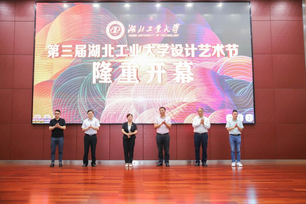 在师生的热切期盼下,胡晓艳、龚发云、张维、丁振国、熊传东、黄海波共同触动主屏幕“手印”,胡晓艳宣布第三届湖北工业大学设计艺术节开幕。