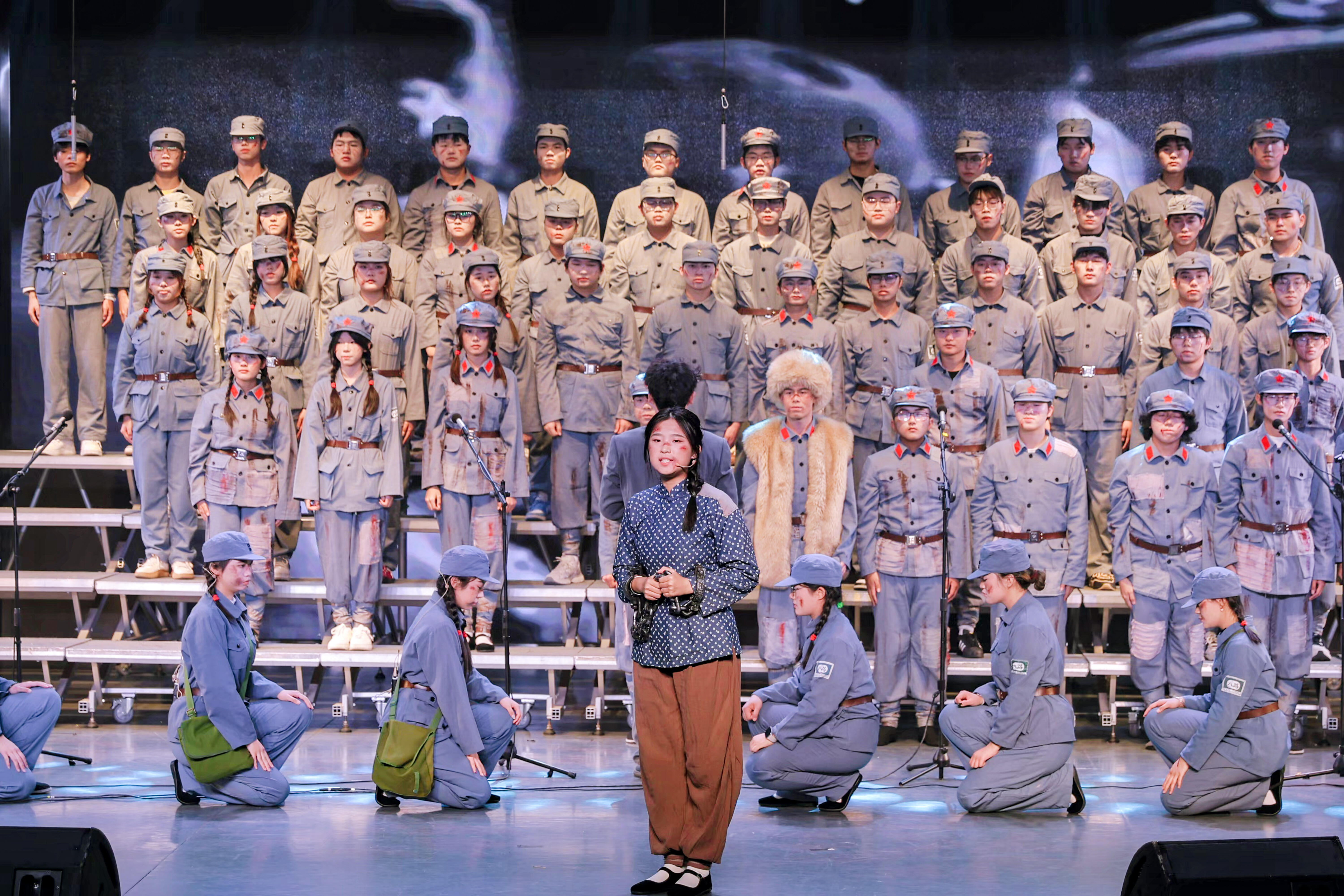 “一曲一史,一词一魂。”90分钟里,10首镌刻着时代印记的歌曲被重新“解码”——《松花江上》的悲怆呼号,把1931年的山河之殇拉回眼前;《太行山上》的铿锵鼓点,再现“母亲叫儿打东洋”的军民深情;《保卫黄河》多声部层层递进,如惊涛拍岸,卷起游击健儿的冲天豪情;穿插其间的舞蹈《九儿》,以红高粱地里的巾帼剪影,折射个人命运与国家兴亡的同频共振。台上,是青年学子自编自演的沉浸式演绎;台下,是情不自禁的跟唱与泪光。雄壮的旋律响彻报告厅,化作一堂最鲜活的“思政课”。旋律起伏间,一条“从苦难到辉煌”的百年征程悄然铺展。