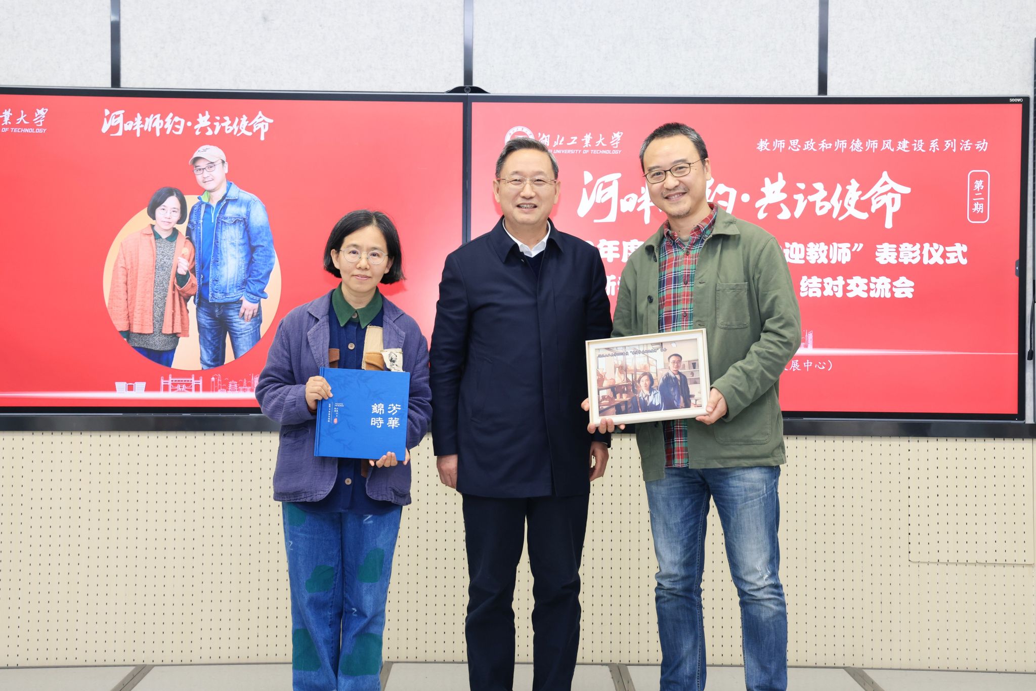 2023年度“最受学生欢迎教师”表彰仪式上,校党委书记彭育园为李海冰、张葳夫妇赠送纪念画册