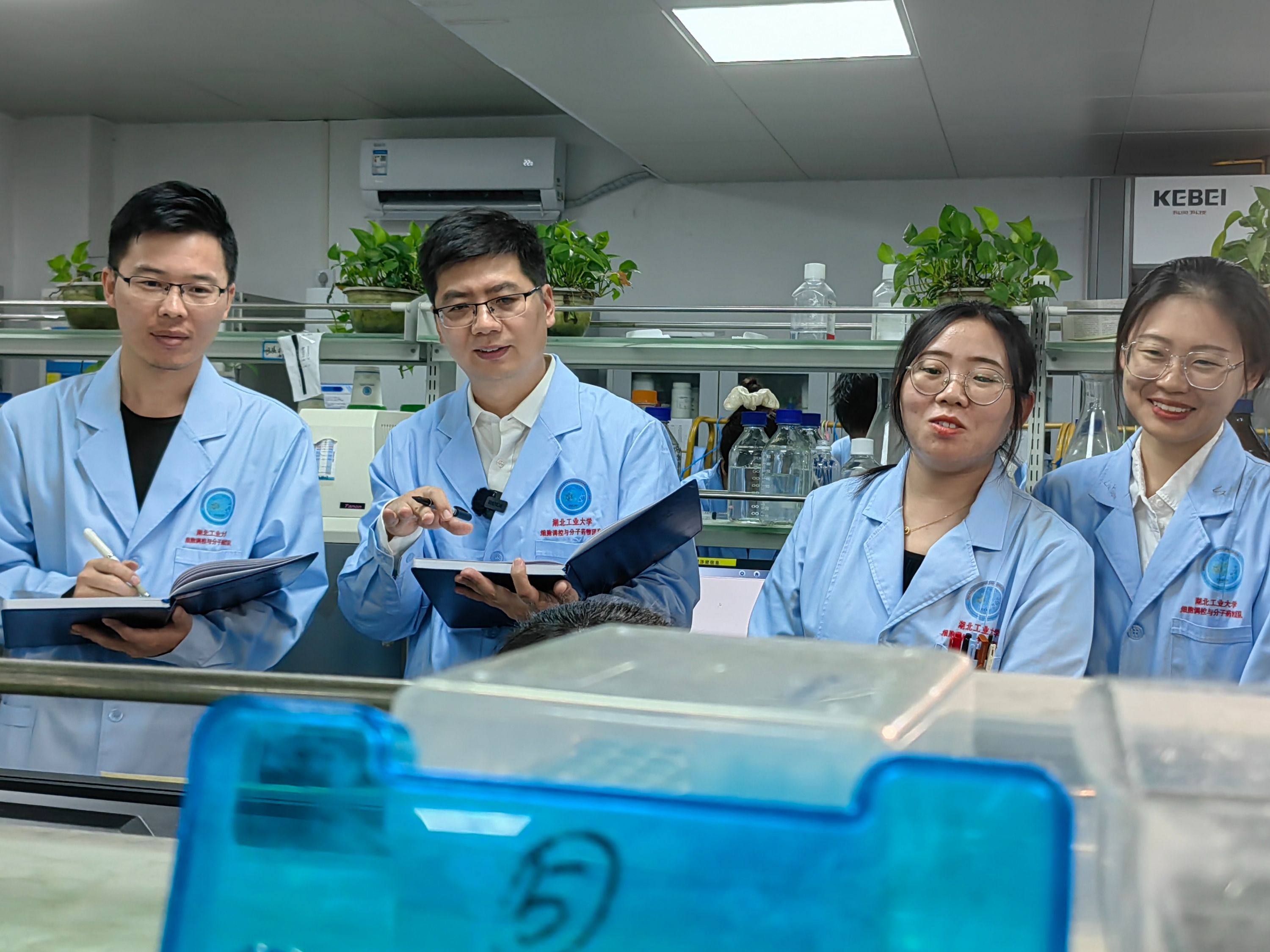 在湖北工业大学细胞调控与分子药物团队实验室,20余个水箱内,用于实验的斑马鱼自由游动着,一旁的科研仪器上,唐景峰教授正指导多位学生观察一条注射了胰腺癌细胞模型的斑马鱼。