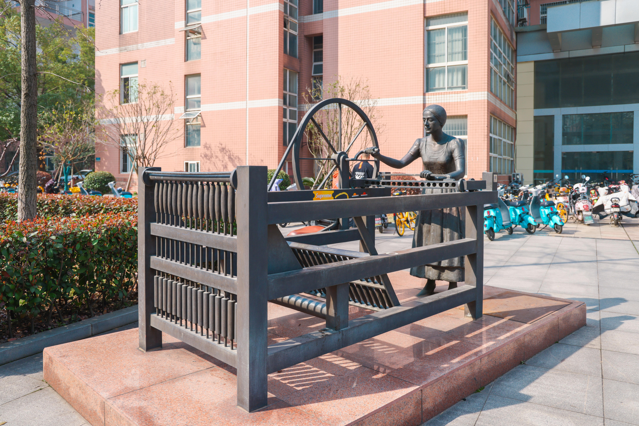 地面钢板折起组成蓬勃向上的抽象雕塑,与生物遗传的DNA抽象形态十分相似,整体也以螺旋上升形态组合。它矗立在校园里,高耸入云,象征着精神飞扬,寓意工业文化长廊有终点,工业发展无止境。激励莘莘学子勇担工业报国的使命,传承科学创新精神,为中国工业的腾飞贡献自己的力量。